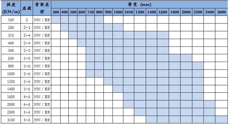 選用尼龍帆布或聚酯帆布作帶芯,帶體彈性好,成槽性能好。選用耐酸堿的材料加工制成覆蓋層,具有良好的抗化學腐蝕性能和良好的物理性能。